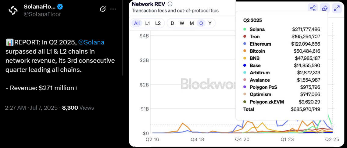 Theo bài đăng trên X từ SolanaFloor, Solana dẫn đầu tất cả các blockchain về doanh thu mạng lưới trong quý thứ ba liên tiếp.