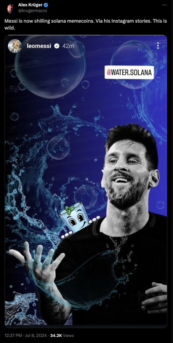 Ngôi sao bóng đá quốc tế Lionel Messi đã tham gia trào lưu meme và quảng bá một memecoin có tên là WaterCoin (WATER) dựa trên Solana thông qua Instagram Stories của mình.