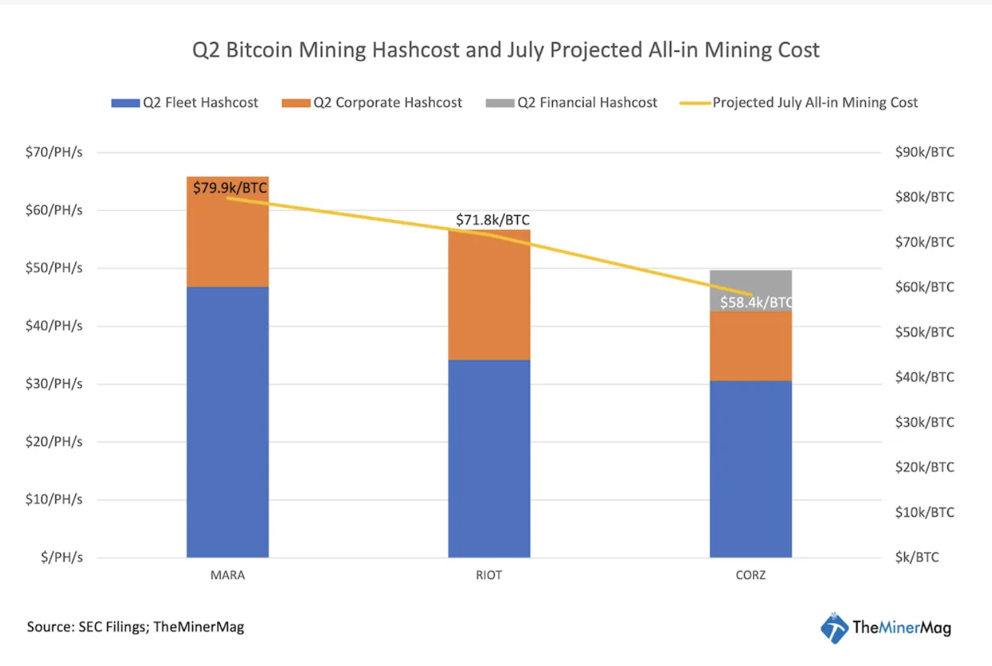 Hầu hết các công ty khai thác công cộng lớn cũng sẽ phải vật lộn để kiếm lợi nhuận ở mức hash price hiện tại, với MARA, Core Scientific và Riot Platforms đều cho thấy tổng chi phí khai thác hàng tháng dự kiến là 60.000 USD trở lên cho mỗi Bitcoin. Dữ liệu tài chính quý 2 cho thấy MARA có tổng chi phí khai thác cao nhất trong tháng 7.