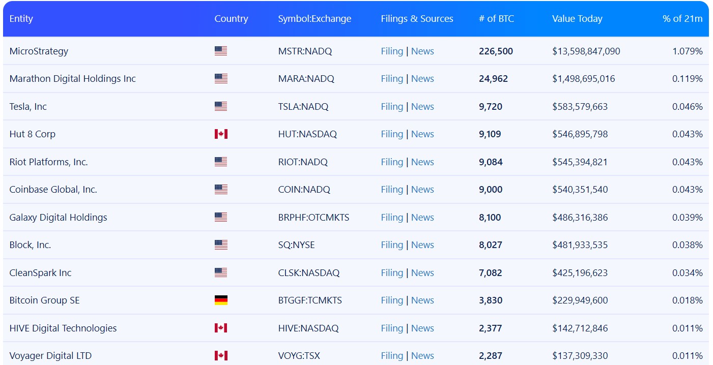 Xu hướng này bắt đầu khi công ty tình báo kinh doanh MicroStrategy mua hơn 21.000 BTC vào tháng 8 năm 2020, biến Bitcoin thành tài sản dự trữ kho bạc chính của công ty. Tính đến tháng 8 năm 2024, công ty tình báo kinh doanh đã tăng lượng nắm giữ lên 226.500 BTC.