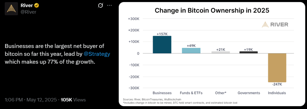 Theo ước tính từ River, các nhà đầu tư cá nhân đã bán tổng cộng 247.000 BTC trong suốt năm 2025 — tương đương khoảng 23 tỷ USD, dựa trên mức giá trung bình trong giai đoạn đó. Trong khi đó, công ty MicroStrategy của Michael Saylor chiếm tới 77% trong số 157.000 BTC được các doanh nghiệp mua vào trong năm nay.