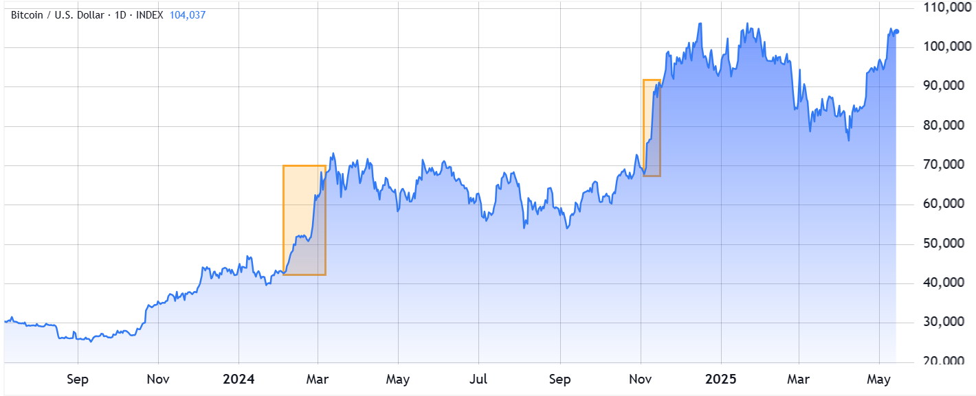 Sự phấn khích của nhà bán lẻ trùng với thời điểm Bitcoin phá vỡ mức cao nhất mọi thời đại trước đó là 73.757 USD vào ngày 6 tháng 11 năm 2024, với sự phấn khích đạt đỉnh chín ngày sau đó. Mặc dù các nhà giao dịch bán lẻ đã bỏ lỡ hầu hết các khoản tăng từ mức 67.000 USD một tháng trước đó, xu hướng tăng giá vẫn tiếp tục khi Bitcoin tăng vọt lên 107.000 USD vào giữa tháng 12 năm 2024.