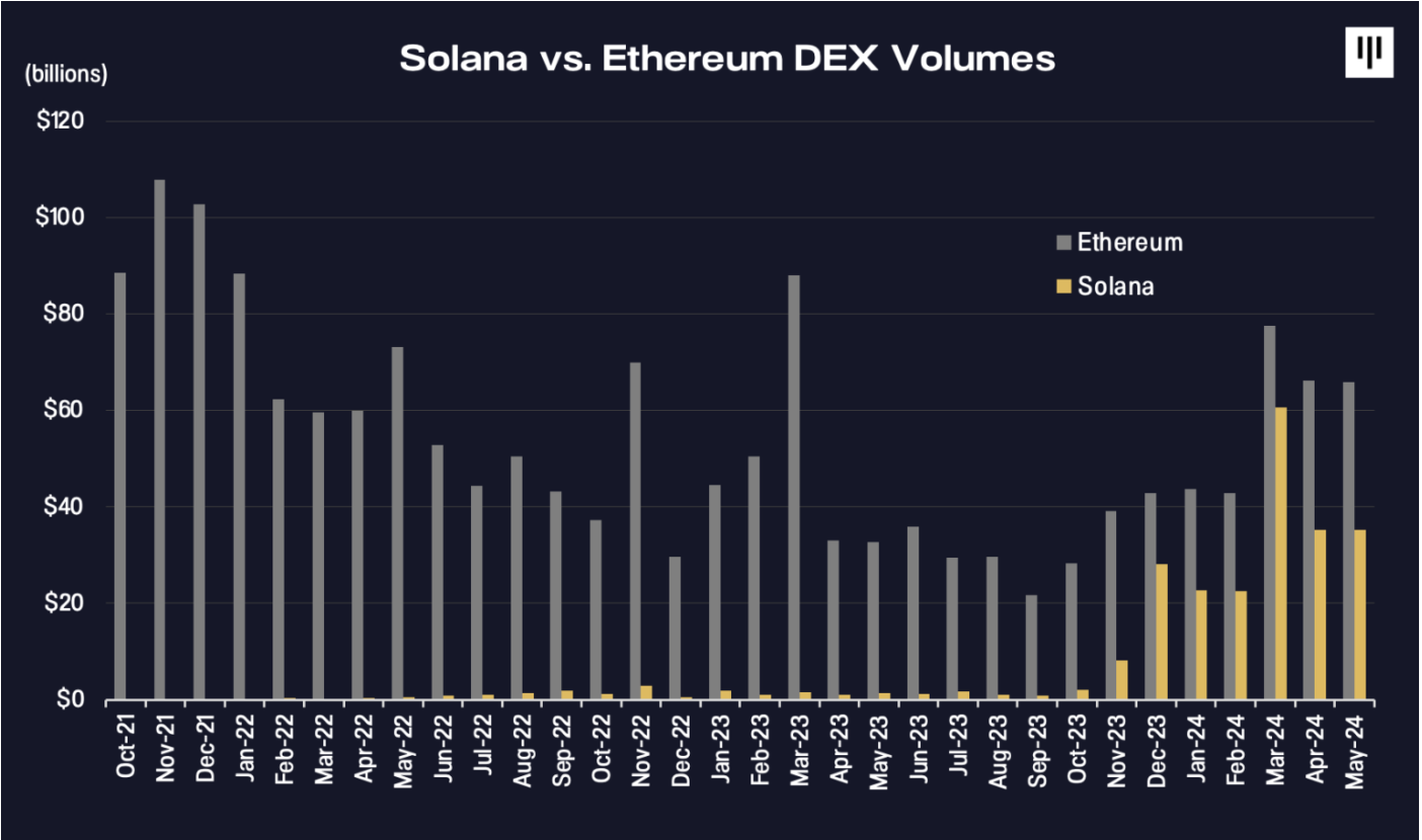 Tỷ trọng khối lượng DEX của Solana đã tăng từ 0% vào đầu năm 2021 lên 24% vào tháng 5 năm 2024, nhờ cách tiếp cận tương tự như kiến trúc macOS của Apple, tích hợp phần cứng và phần mềm để có hiệu suất vượt trội. Theo Pantera, kiến trúc của Solana đã cho phép hoạt động bán lẻ tăng đột biến trong vài tháng qua: