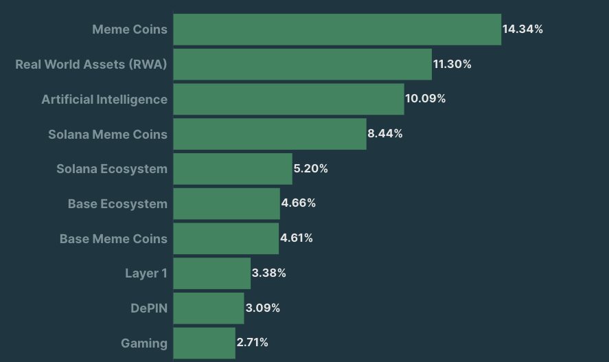 Theo dữ liệu của CoinGecko, memecoin, RWA và AI là ba câu chuyện hàng đầu trong quý 2 năm 2023, chiếm tới 36% tổng số lưu lượng truy cập web của CoinGecko trong quý. Tỷ lệ này tương tự như quý 1 năm 2024, như đã nêu trong báo cáo.
