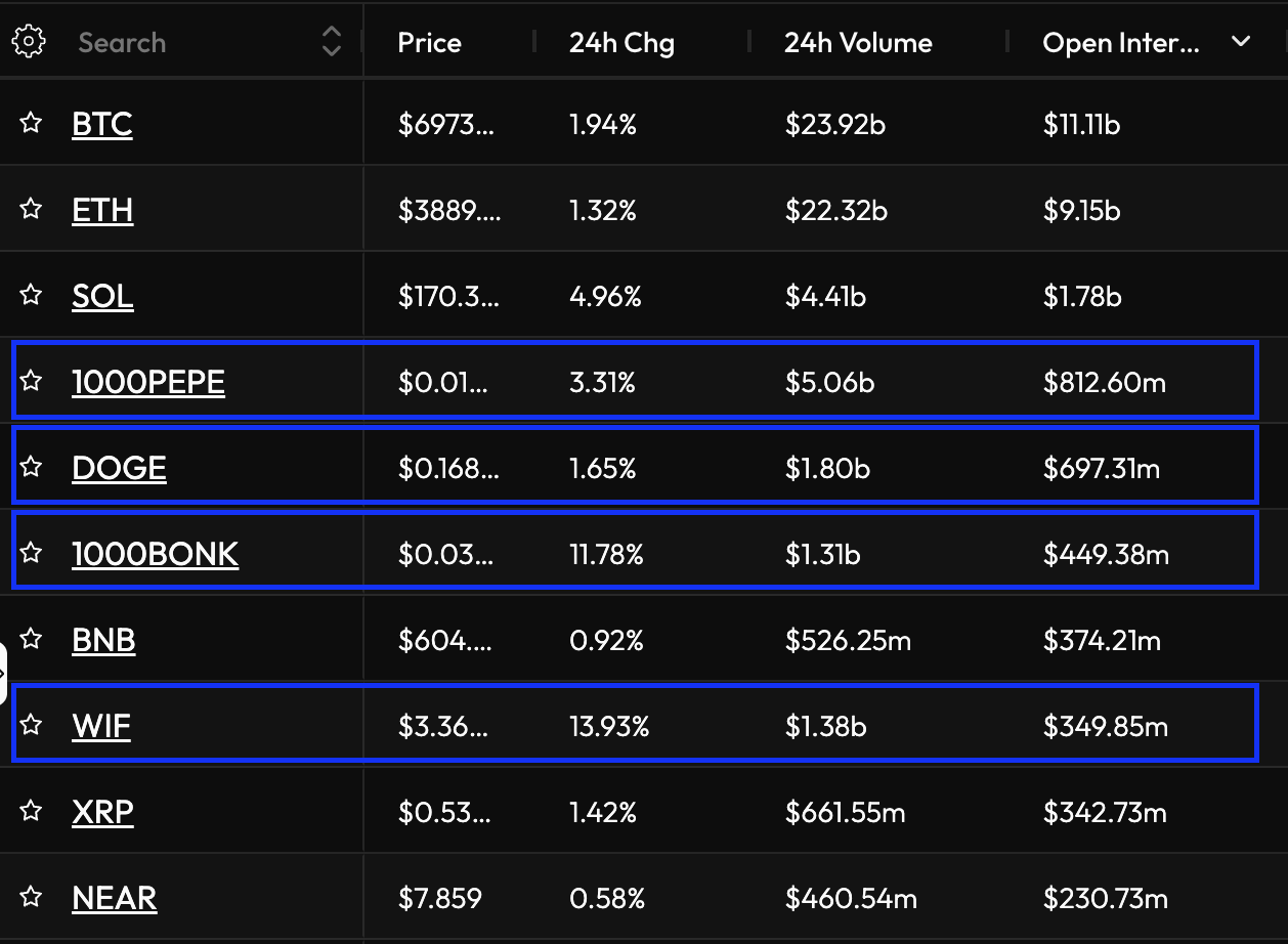 Bốn trong số 10 loại tiền điện tử hàng đầu theo lãi suất mở (OI) là memecoin, trong đó Pepe (PEPE) dẫn đầu với 812,6 triệu USD OI và gần một nửa so với Solana (SOL) 1,7 tỷ USD OI.