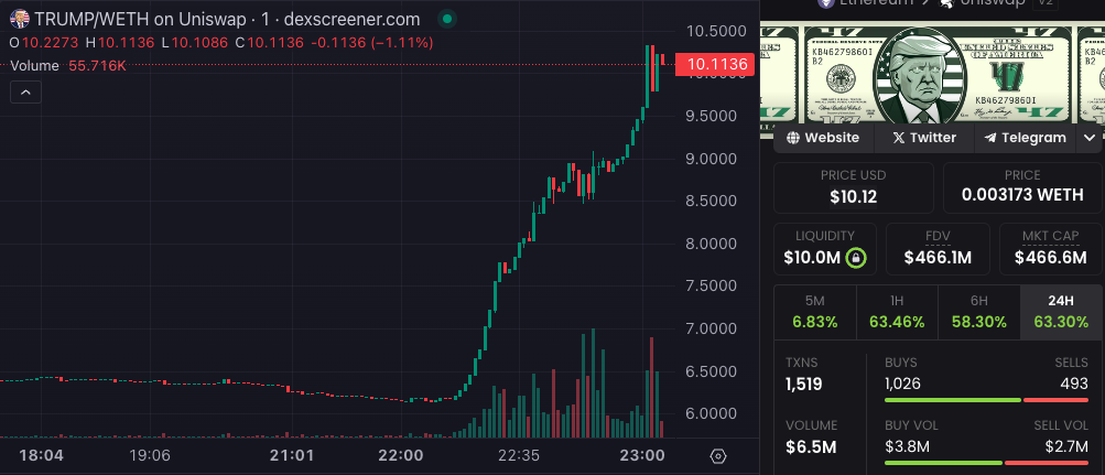 Đồng memecoin MAGA (TRUMP) dựa trên Ethereum đã tăng vọt nhanh chóng từ mức giá 6,31 USD lên 10,36 USD ngay sau vụ ám sát, chứng kiến tổng vốn hóa thị trường tăng vọt từ 293 triệu USD lên 469 triệu USD trong vòng chưa đầy 45 phút, theo dữ liệu của DexScreener.