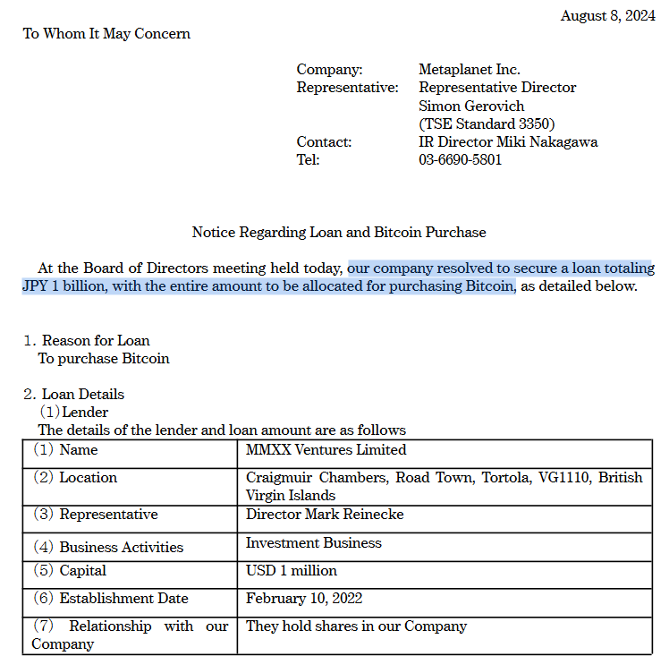 Khoản vay từ MMXX Ventures — một cổ đông của Metaplanet — có lãi suất 0,1% mỗi năm và thời hạn sáu tháng bắt đầu từ ngày 8 tháng 8. Công ty tiết lộ trong một tuyên bố rằng khoản vay này sẽ được trả lại một lần.