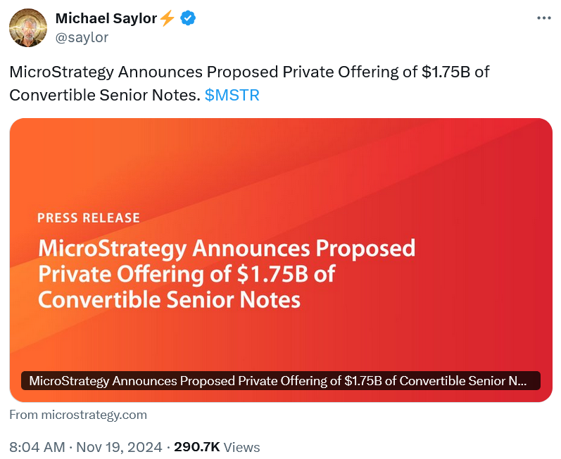 Trong tuyên bố ngày 18 tháng 11, MicroStrategy cho biết họ “có ý định sử dụng số tiền thu được từ đợt chào bán này để mua thêm bitcoin và sử dụng cho mục đích chung của công ty”.
