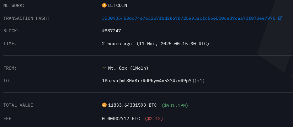 Sàn giao dịch tiền điện tử không còn tồn tại Mt. Gox đã di chuyển gần một tỷ USD Bitcoin, đây là giao dịch BTC lớn thứ hai trong một tuần, khi giá Bitcoin giảm xuống mức thấp nhất trong bốn tháng vào ngày 11 tháng 3.