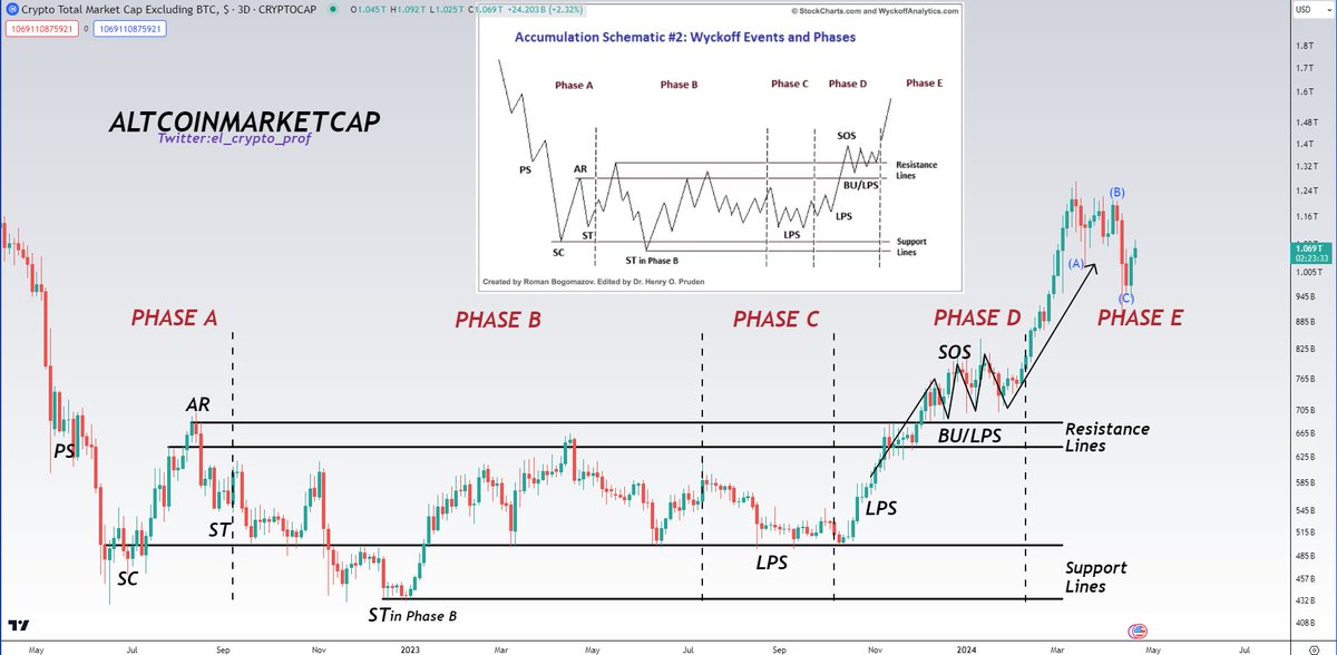 Vào ngày 24 tháng 4, nhà giao dịch và nhà phân tích Mustache đã quan sát thấy TOTAL2 – tổng vốn hóa thị trường của các altcoin – đã hoàn thành các giai đoạn điều chỉnh ABC của phương pháp Wyckoff và đang ở giữa một breakout.