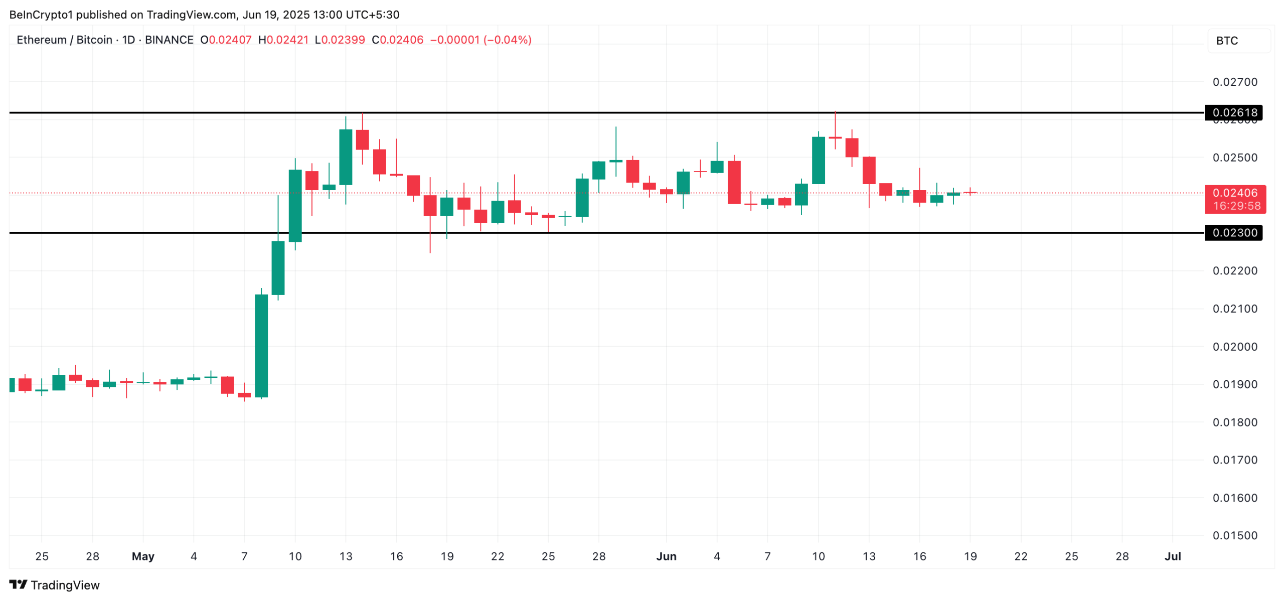 Tỷ lệ ETH/BTC, được các nhà giao dịch sử dụng để đo lường sức mạnh tương đối của Ethereum so với Bitcoin, đã duy trì trong một phạm vi hợp nhất chặt chẽ kể từ giữa tháng 05. Điều này cho thấy altcoin này tiếp tục hoạt động kém hơn so với đồng tiền dẫn đầu thị trường.