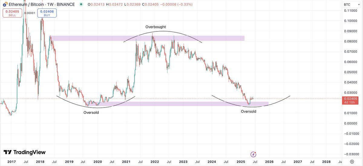 Đọc từ biểu đồ cung cấp cho thấy cặp này đang dao động quanh mức 0.024, nơi các đáy chu kỳ trước đó đã hình thành. Các cấu trúc tương tự vào năm 2019 và 2020 đã chứng kiến ETH phục hồi mạnh mẽ so với BTC sau các giai đoạn hoạt động kém kéo dài. Tuy nhiên, như Crypto Fella chỉ ra, “chúng ta cần thấy một số sức mạnh trước khi có thể thấy sự đảo chiều lớn”.