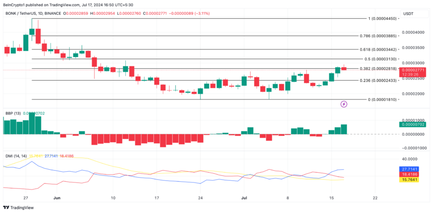 Hơn nữa, thiết lập Directional Movement Index (DMI) của BONK cho thấy vị thế trên là đáng tin cậy. Tại thời điểm viết bài, chỉ báo định hướng tích cực (+DI) (màu xanh) của token nằm trên chỉ báo định hướng tiêu cực (-DI).