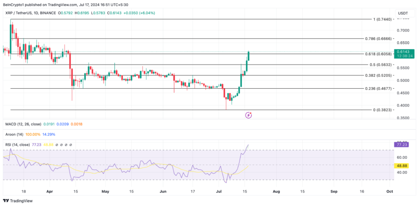 Đợt tăng giá 38% của Ripple (XRP) trong bảy ngày qua đã đẩy giá lên mức cao nhất trong nhiều tháng. Token hiện đang giao dịch ở mức 0,61 USD, mức giá mà nó quan sát được lần cuối vào ngày 12 tháng 4.