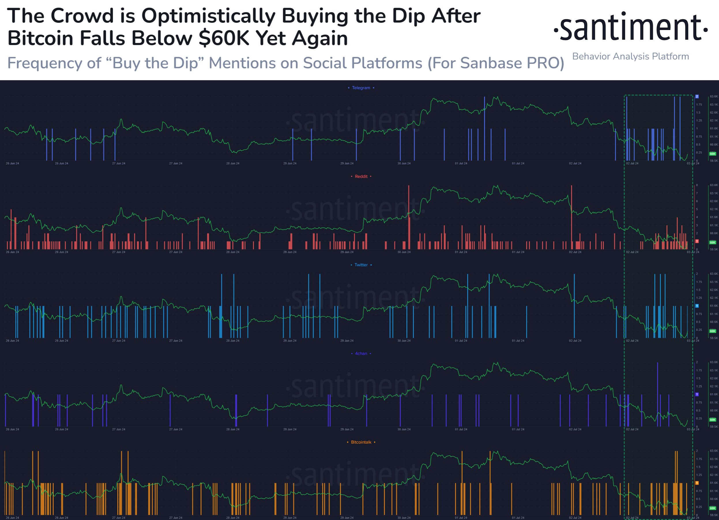 Lượt đề cập đến “mua khi giá giảm” trên các nền tảng xã hội Reddit, X, 4chan và Bitcoin Talk đã tăng gấp đôi trong hai ngày qua khi Bitcoin giảm xuống dưới 60.000 USD lần thứ hai trong bốn tháng.