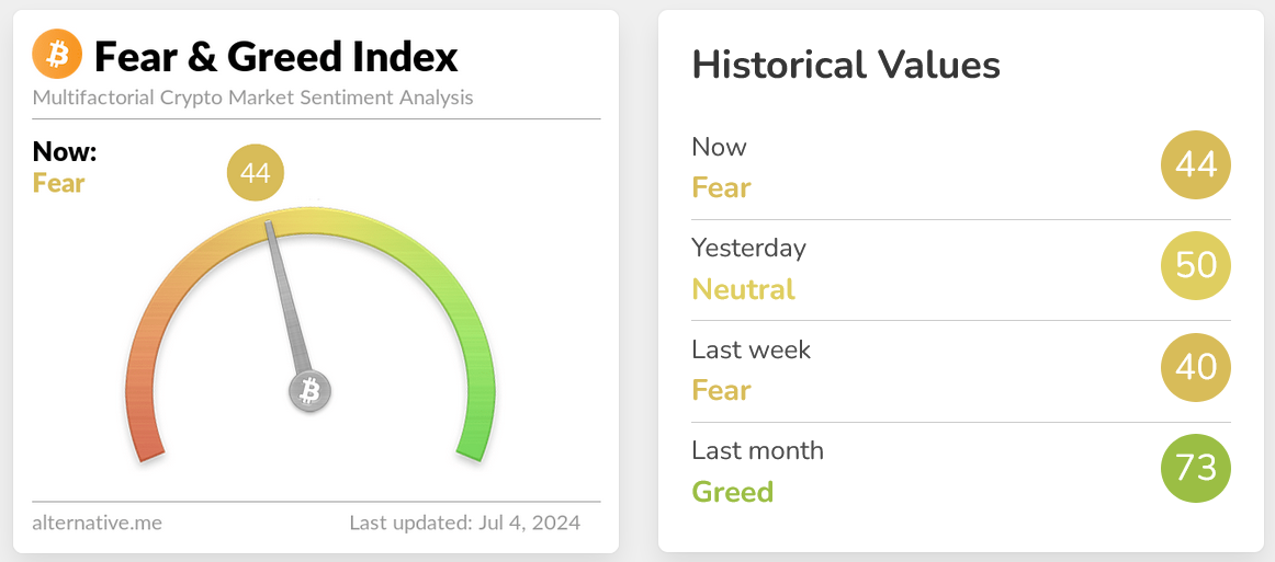 Chỉ số Sợ hãi và Tham lam tiền điện tử, thước đo tâm lý thị trường đối với Bitcoin và ngành công nghiệp tiền điện tử nói chung, hiện đang ở vùng “Sợ hãi” với số điểm là 44 trên 100.