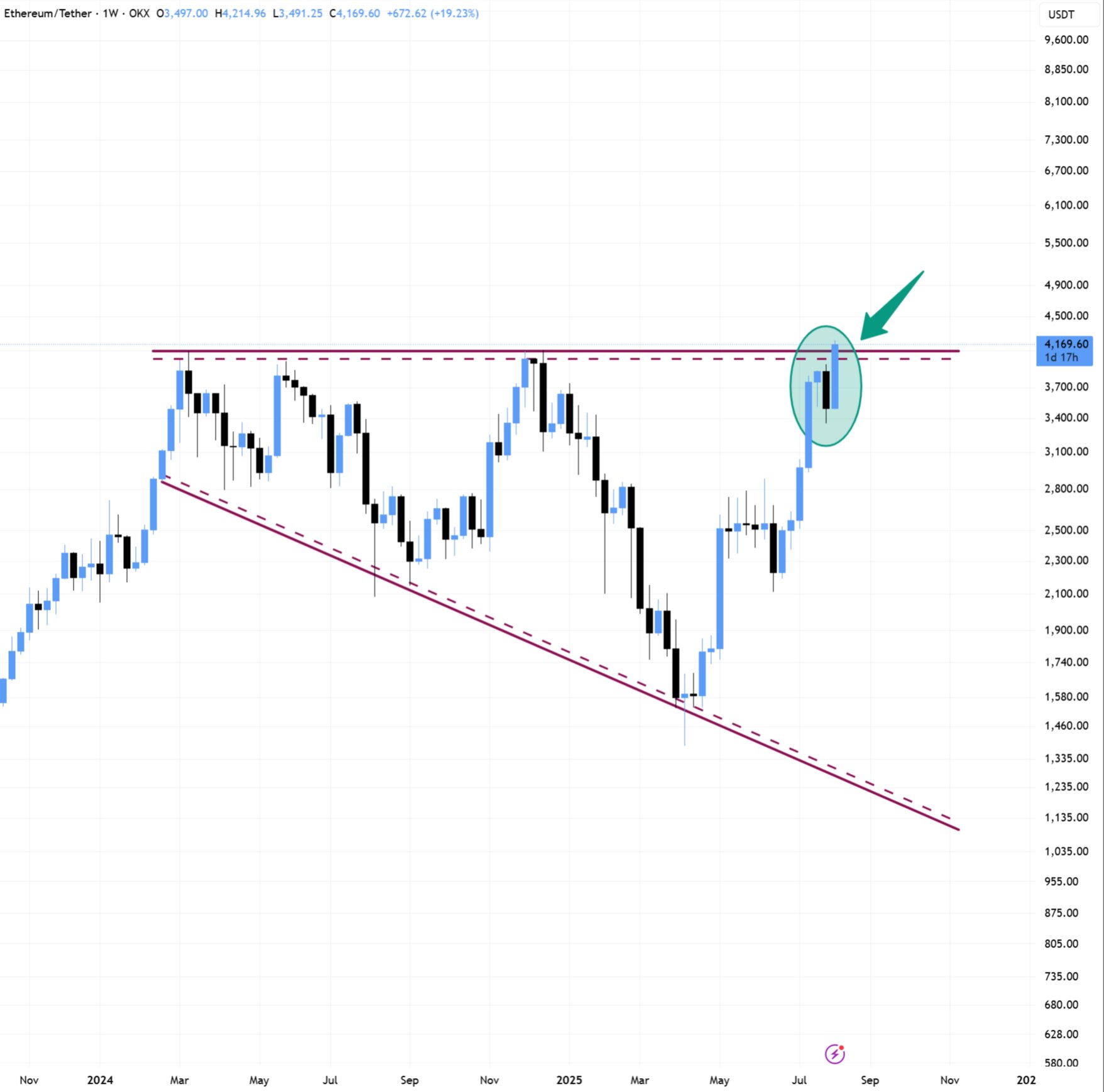 Một lần bứt phá có thể thay đổi tất cả. ETH đang chạy trong cùng một kênh đã đưa nó từ 100 USD lên 4.000 USD.