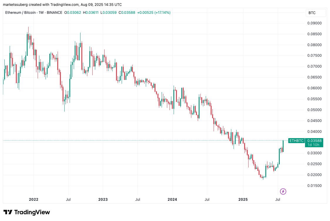 Cặp ETH/BTC, dù đã tăng hơn 15% trong tuần qua, vẫn đang dao động quanh mức mở cửa của năm.