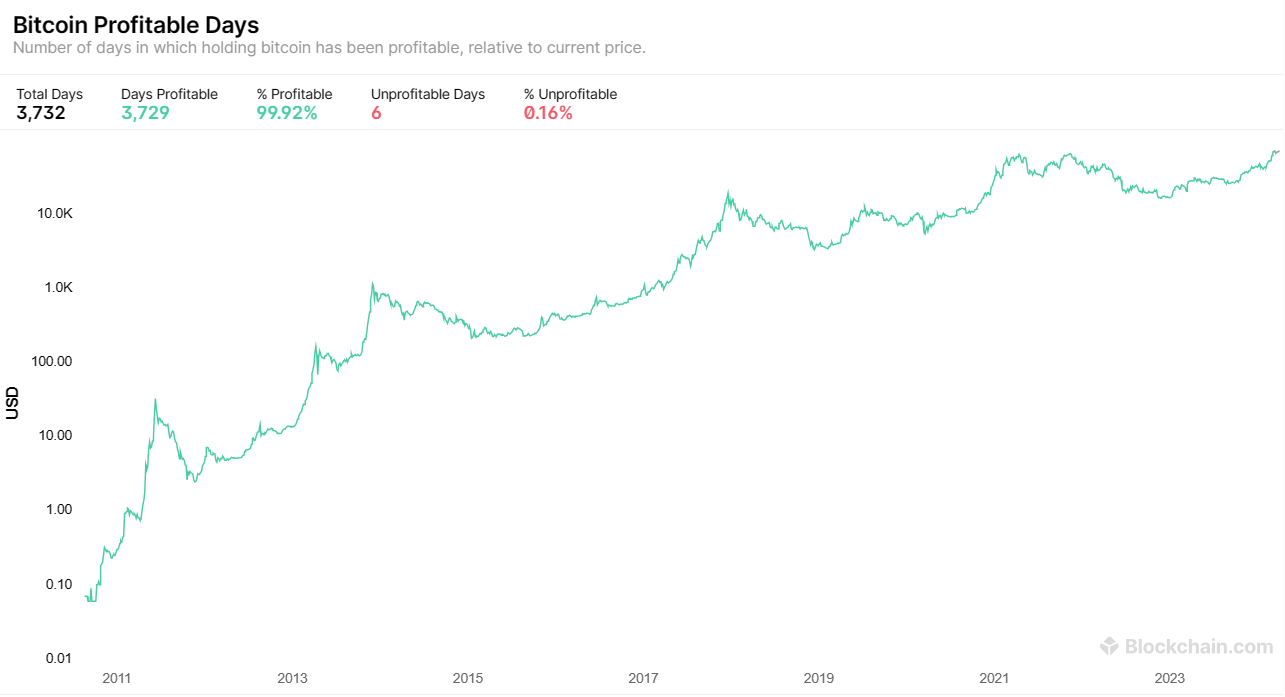 Những người chơi bitcoin đã duy trì danh mục đầu tư có lãi trong 99,92% số ngày, chỉ còn lại sáu ngày khi đầu tư vào Bitcoin (BTC) không mang lại lợi nhuận kể từ khi nó ra mắt hơn 14 năm trước, vào ngày 3 tháng 1 năm 2009.