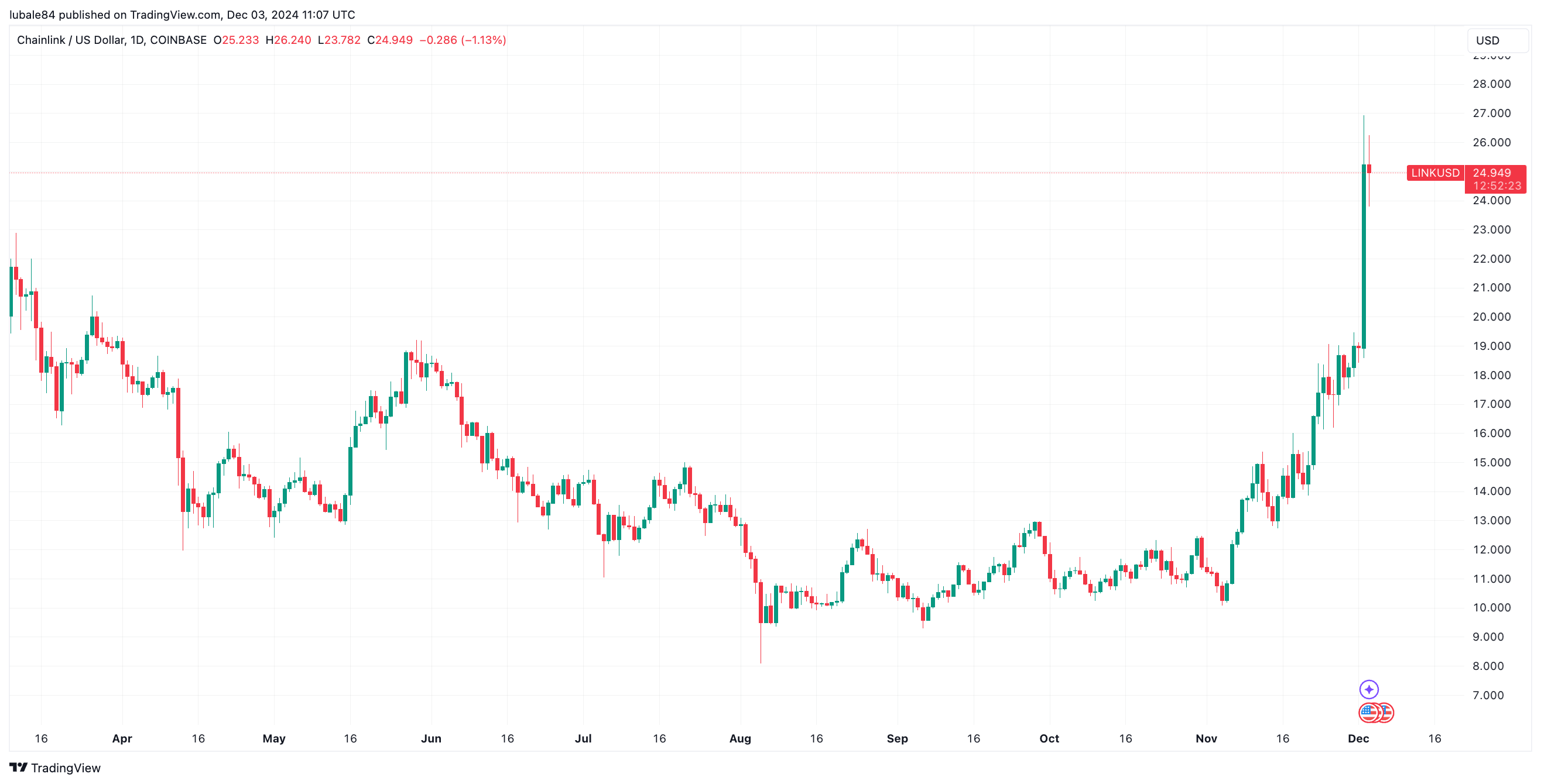 Dữ liệu từ TradingView cho thấy LINK đã vẽ một “nến thần” vào ngày 3 tháng 12, tăng từ mức thấp là 18,58 USD và tăng tới 45% lên mức cao nhất trong hai năm là 26,92 USD.