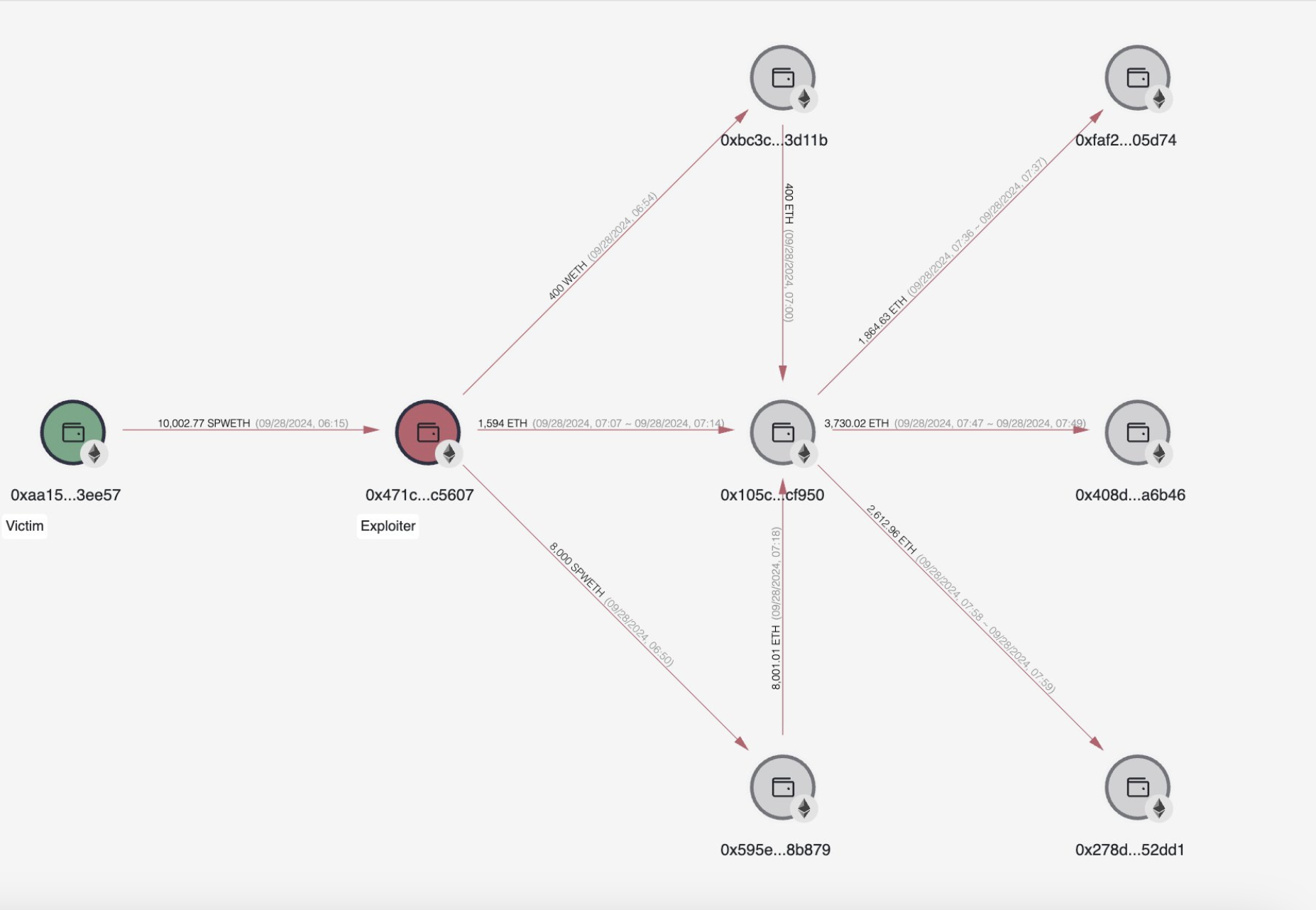 Theo công ty bảo mật CertiK, 10.000 spWETH, trị giá khoảng 26 triệu USD, ban đầu được gửi đến một ví bắt đầu bằng “0x471c”. Một phần trong số tiền này sau đó đã được chuyển đến 4 ví khác.