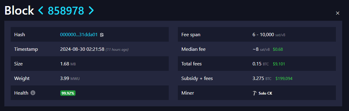 Theo dữ liệu của Mempool.space, trình khai thác Solo CK đã sử dụng hashrate tương đương 456 petahashes khi khối được giải quyết.
