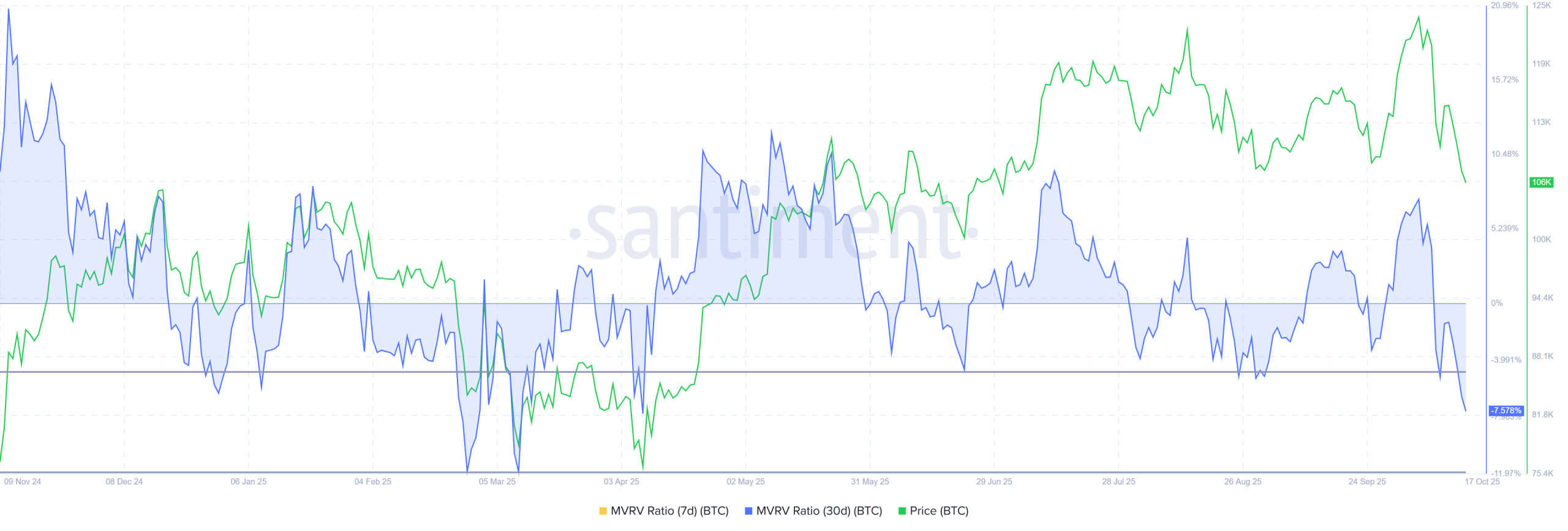 Tỷ lệ Giá trị Thị trường trên Giá trị Thực tế (MVRV) của Bitcoin trong 30 ngày hiện tại là -7.56%, cho thấy các nhà đầu tư mua vào trong tháng qua đang chịu lỗ chưa thực hiện khoảng 7.5%.
