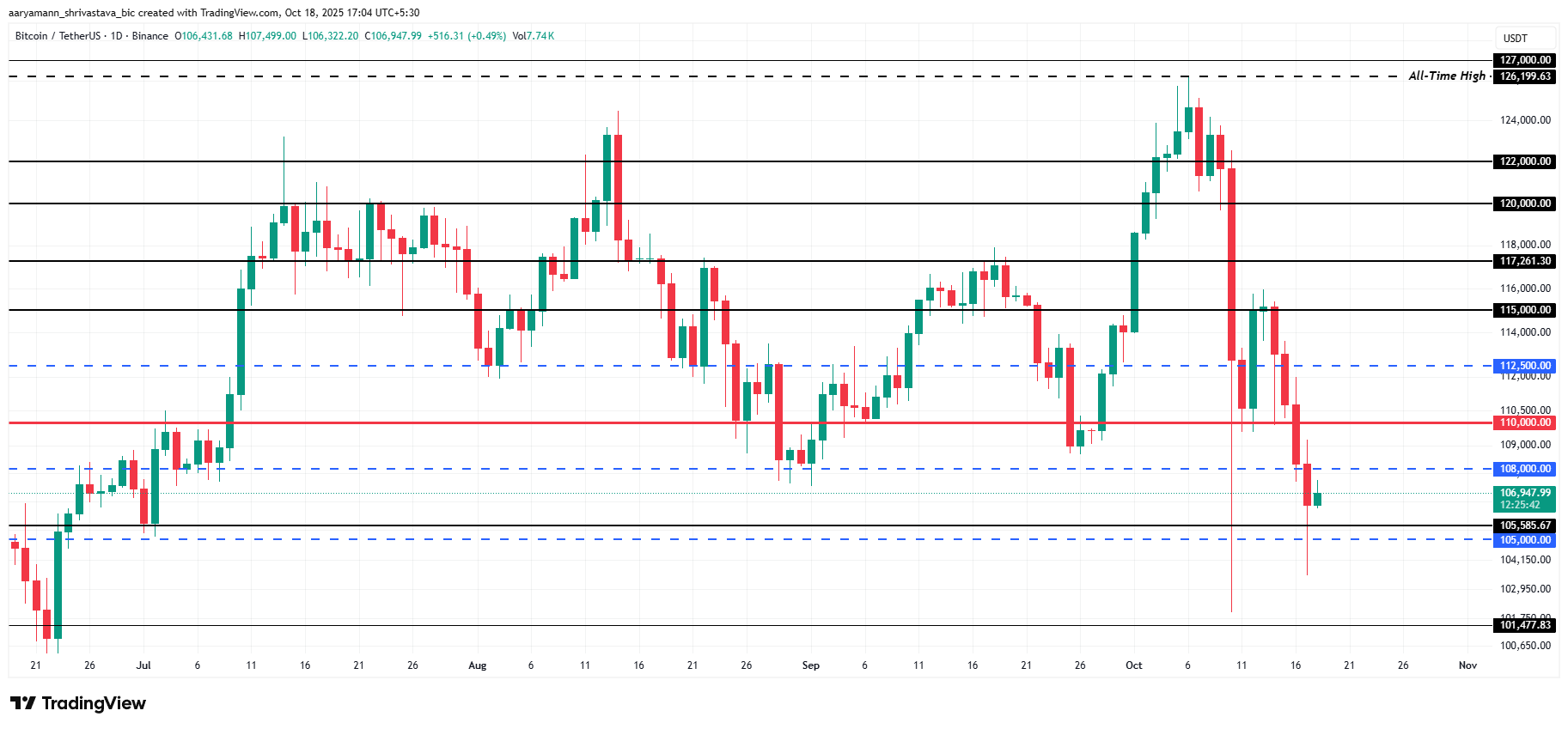 Tại thời điểm viết bài, Bitcoin giao dịch ở mức 106,947 USD, nằm dưới mức quan trọng 108,000 USD từng là hỗ trợ mạnh. Sự mất mát này đã làm tăng sự biến động trên thị trường, nhưng một đợt phục hồi vẫn có thể xảy ra nếu động lực mua vào được duy trì.