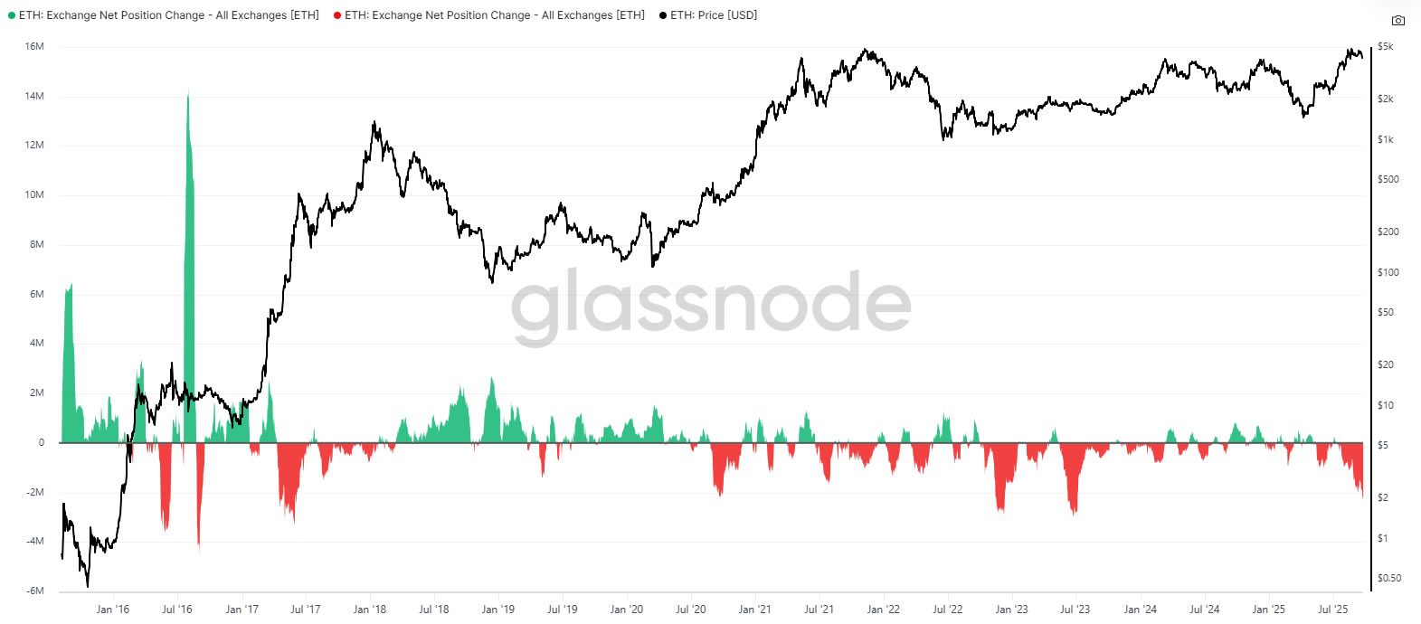 Thay đổi vị thế ròng của sàn giao dịch đạt đỉnh -2 triệu ETH. Nguồn: Glassnode.