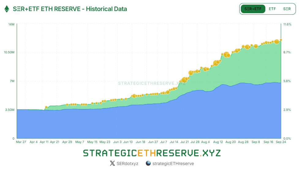 Theo StrategicEthReserve, kể từ tháng 4, khoảng 68 tổ chức đã thu về 5,26 triệu ETH trị giá khoảng 21,7 tỷ USD và chiếm 4,3% tổng nguồn cung.