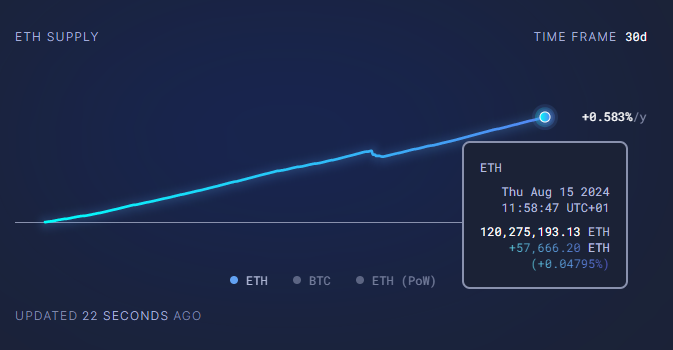 Theo dữ liệu mới nhất trên Ultrasound.money, nguồn cung ETH đã tăng lên khoảng 120,28 triệu ETH, với 77.091 ETH được phát hành trong 30 ngày qua.