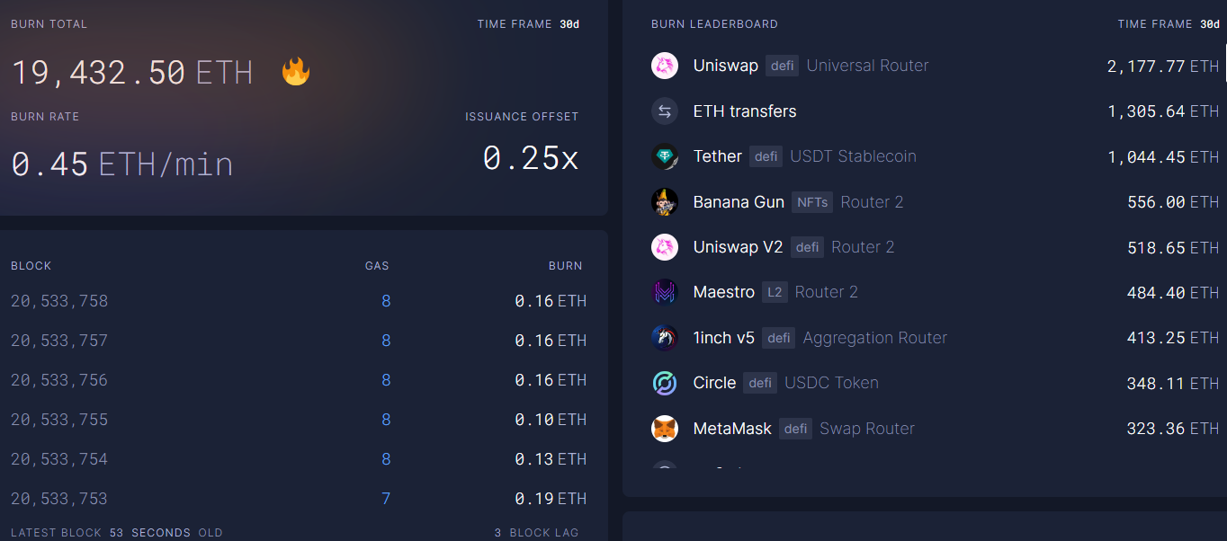 Bên cạnh 77.091 ETH được phát hành trong 30 ngày qua, 19.438 ETH đã bị đốt thông qua cơ chế đốt, dẫn đến nguồn cung ròng tăng khoảng 57.653 ETH.