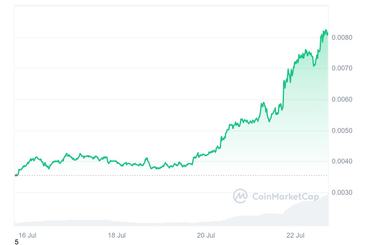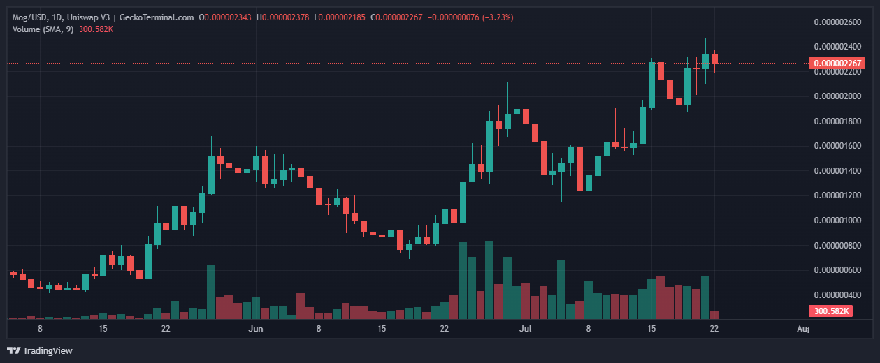 Ví dụ, token meme dựa trên Ethereum là Mogcoin (MOG) đã đạt mức cao kỷ lục mới vào ngày 22 tháng 7, đạt vốn hóa thị trường hơn 820 triệu USD, theo dữ liệu của GeckoTerminal.