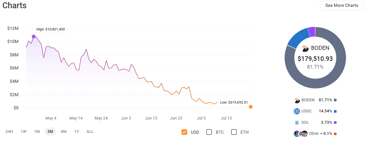 Vào thời kỳ đỉnh cao định giá, ví này có giá trị hơn 10,8 triệu USD vào cuối tháng 4, nhưng đã giảm xuống mức hiện tại là 219.000 USD theo dữ liệu của CoinStats.