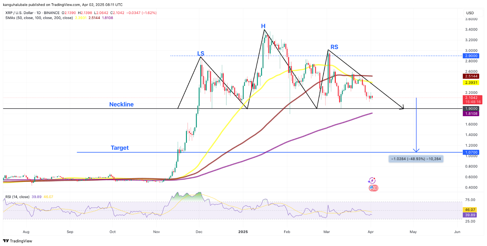 Biểu đồ hàng ngày XRP/USD với mô hình H&S. Nguồn: TradingView.