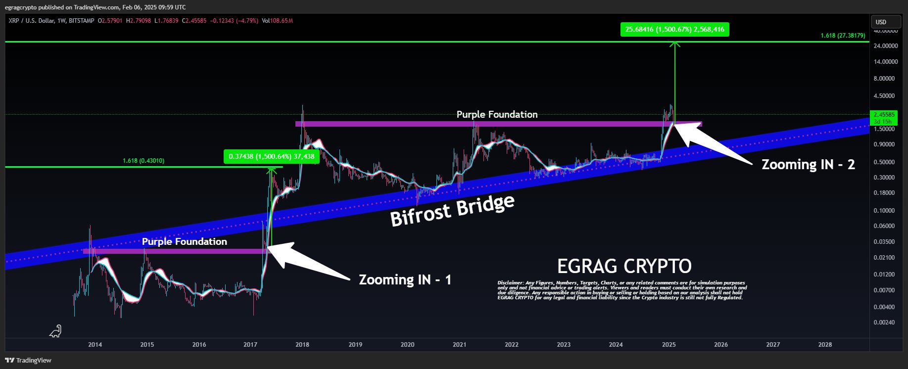 Điều này phản ánh một fractal năm 2017 khi giá XRP chạm đến Purple Foundation và gần chạm đến BMSB, dẫn đến mức tăng đáng kinh ngạc 1500% chỉ trong 4 tuần. Đợt tăng giá này nhắm đến mức mở rộng Fibonacci 1,618 từ mức thấp của chu kỳ.