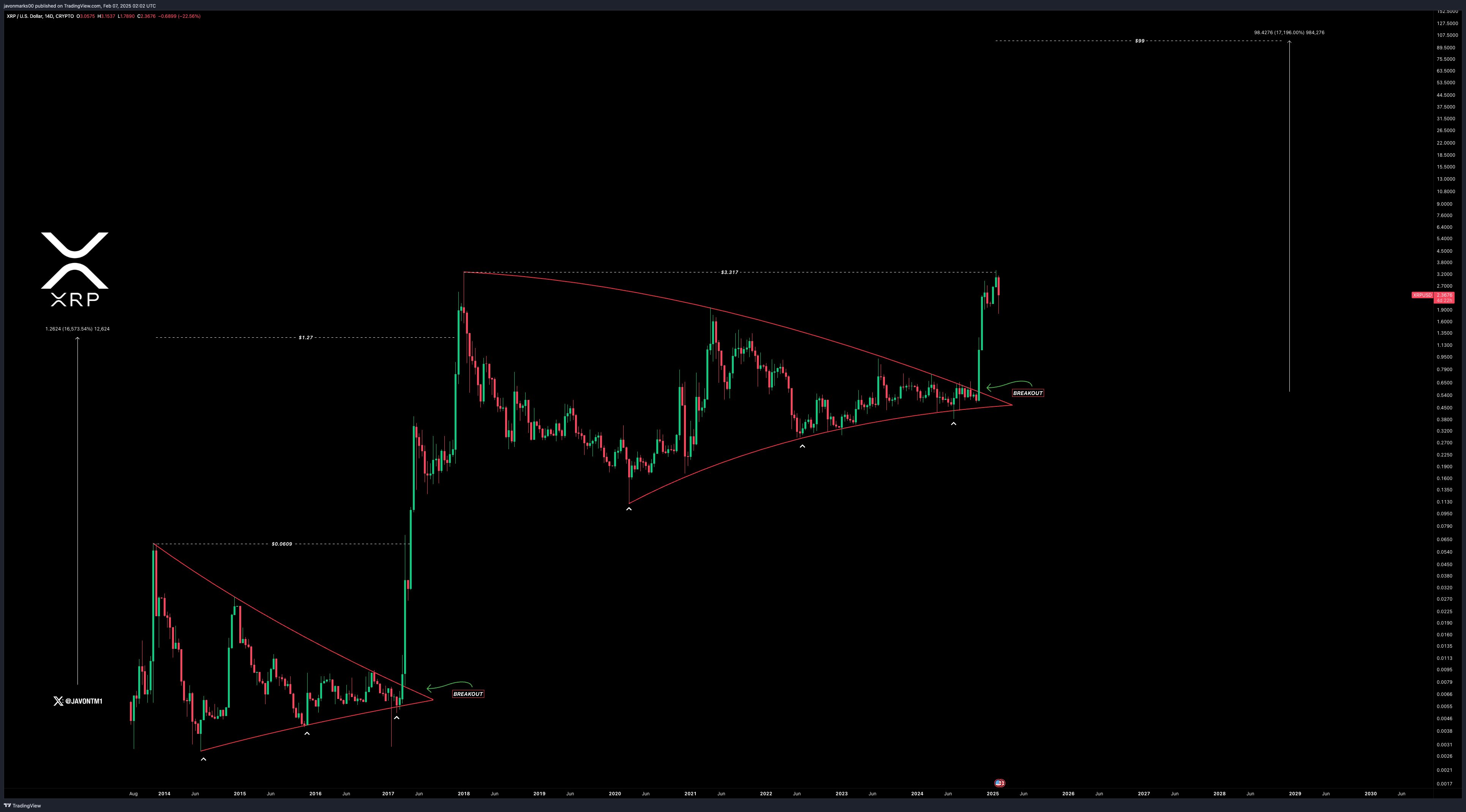 Mục tiêu thứ hai hiện tại của XRP là 99 USD, tăng hơn 3.900%, tức là gấp hơn 40 lần so với mức hiện tại và dựa trên hiệu suất trong quá khứ, làn sóng tiếp theo có thể rất lớn, cuối cùng không chỉ dẫn đến việc đạt được mà còn vượt qua mức đó.