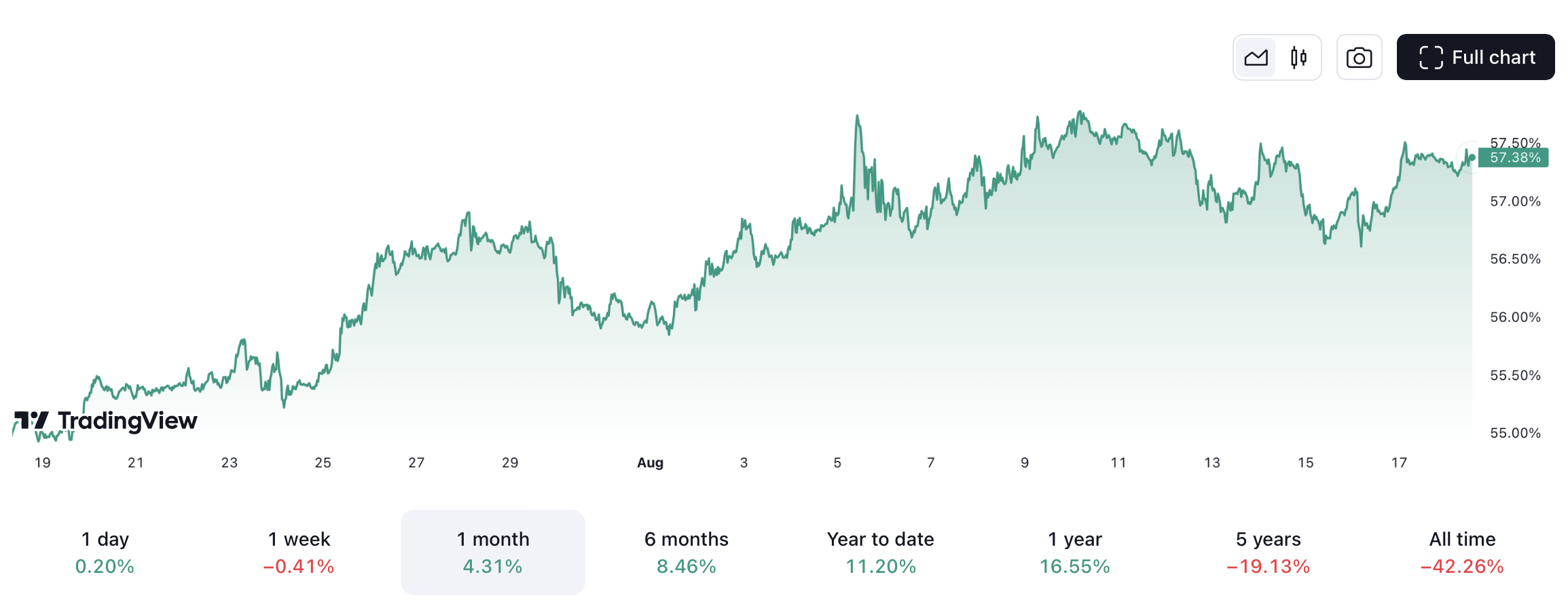 Tại thời điểm viết bài, tỷ lệ thống trị của Bitcoin là 57,36%, tăng 4,25% kể từ ngày 18 tháng 7, theo dữ liệu của TradingView.