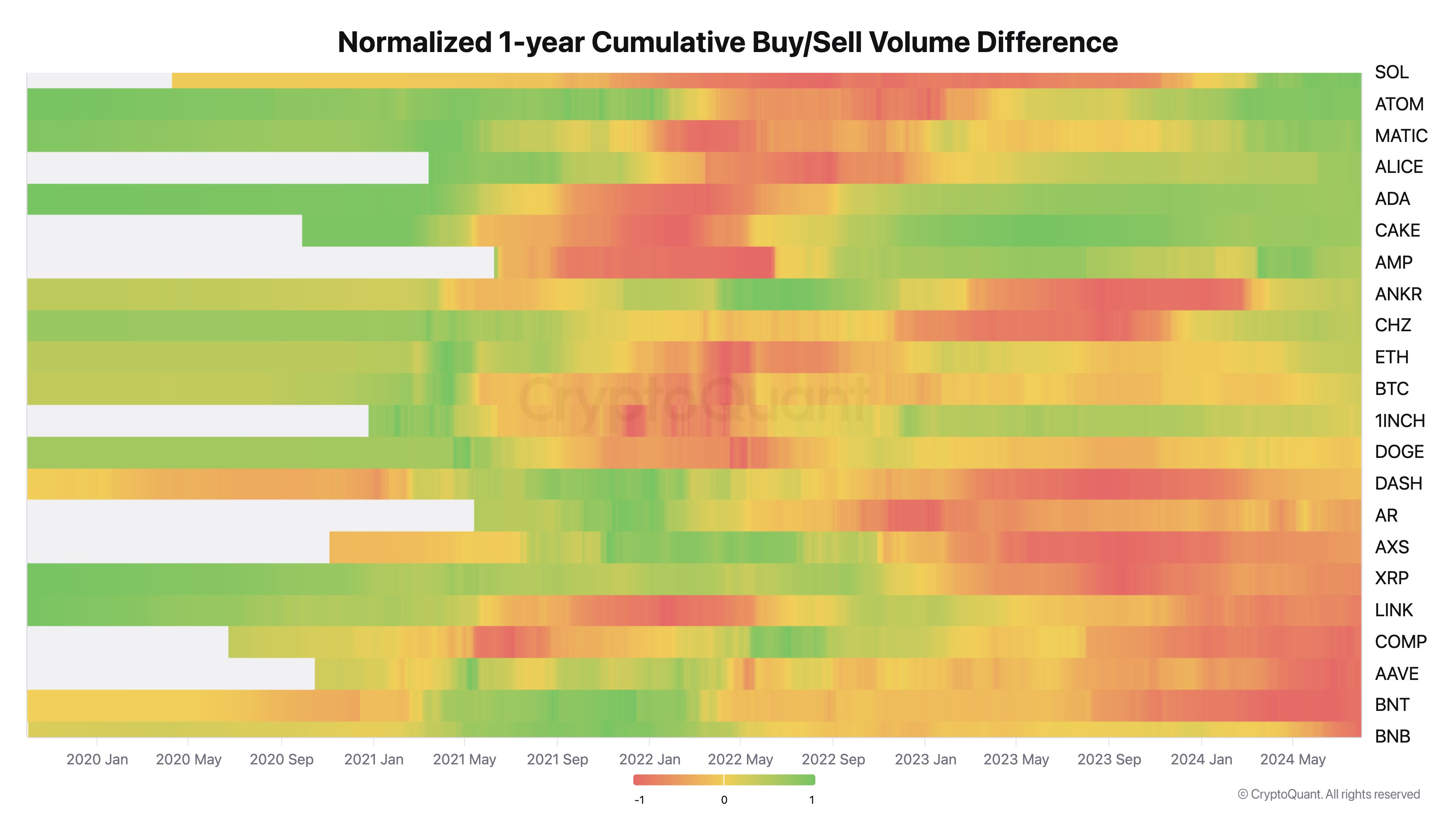Phân tích của Ju tập trung vào Chênh lệch khối lượng báo giá mua/bán tích lũy trong 1 năm đối với Altcoin (1-Year Cumulative Buy/Sell Quote Volume Difference for Altcoins), một số liệu đo lường sự khác biệt giữa lệnh giới hạn mua và bán trong khoảng thời gian một năm.