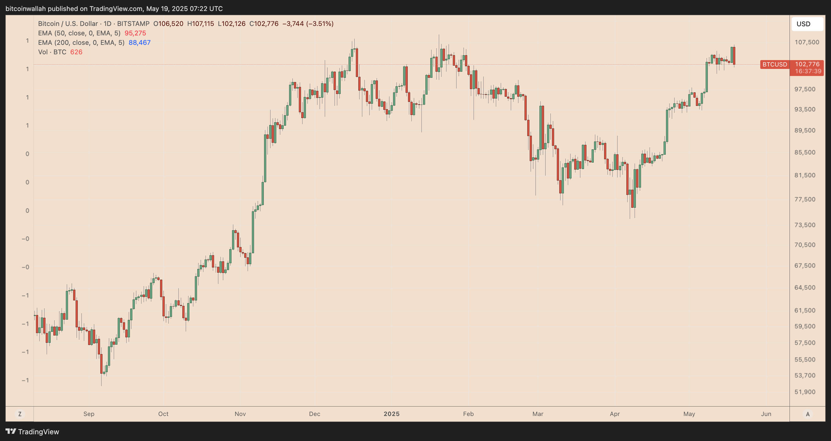 Bitcoin đã giảm hơn 4,5% so với mức cao nhất trong ngày vào ngày 19 tháng 5, xuống còn khoảng 102.000 USD, mức giảm hàng ngày tồi tệ nhất trong hơn một tháng.