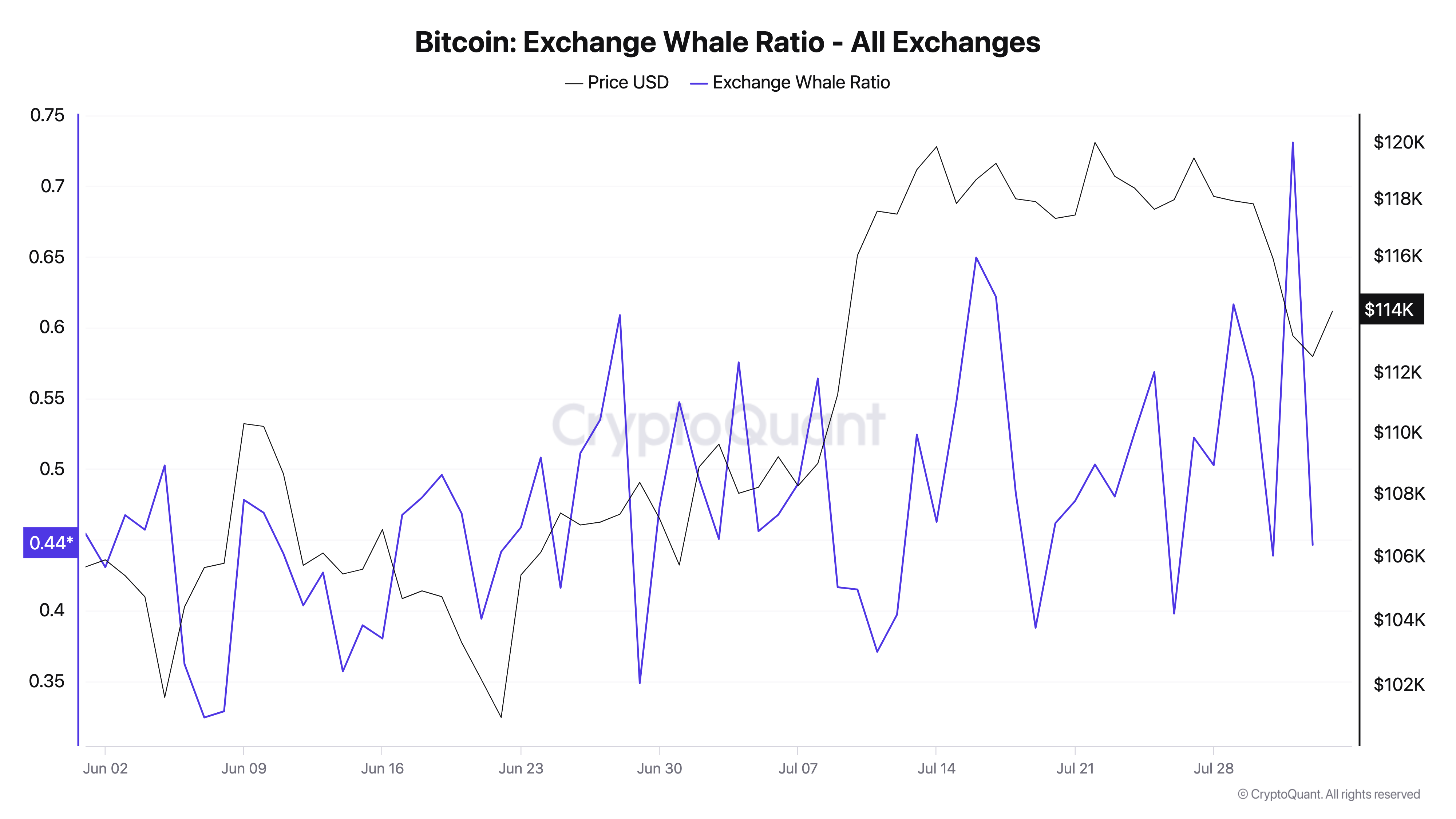 Ngược lại, chỉ số Tỷ lệ Cá voi trên sàn (Exchange Whale Ratio) đã tăng vượt mức 0.70, cho thấy phần lớn lượng BTC nạp vào sàn là từ cá voi.