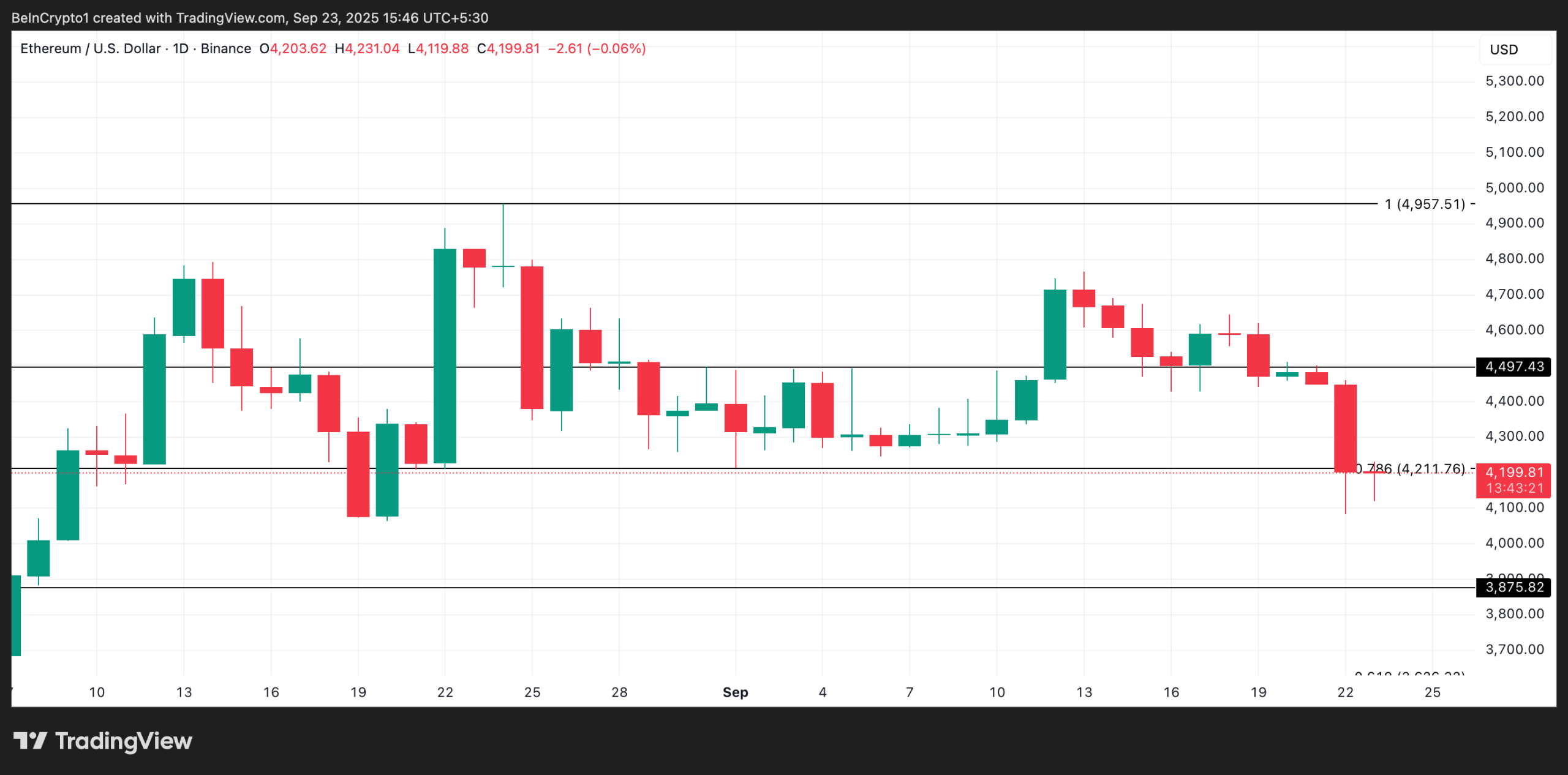 Hiện tại, ETH đang giao dịch ở mức 4,196 USD, với việc bán ra từ các nhà đầu tư lớn làm dấy lên lo ngại về những tổn thất sâu hơn. Nếu áp lực bán tiếp tục, ETH có thể phá vỡ mức 4,000 USD và kiểm tra hỗ trợ quanh mức 3,875 USD.