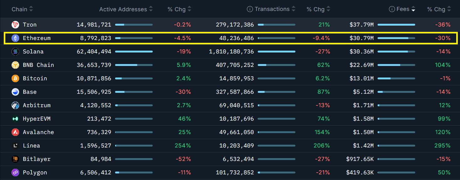 Theo Nansen, phí mạng lưới Ethereum đã giảm 30% trong tháng qua, trong khi giao dịch giảm 10%. Ngược lại, phí trên BNB Chain, Avalanche và HyperEVM tăng gấp đôi, và số lượng giao dịch tăng 60% trở lên trong cùng kỳ. Mặc dù lượng tiền gửi vào hợp đồng thông minh Ethereum đã tăng 5% trong tháng, các nhà giao dịch vẫn lo ngại rằng các đối thủ cạnh tranh đang dần thu hẹp khoảng cách.