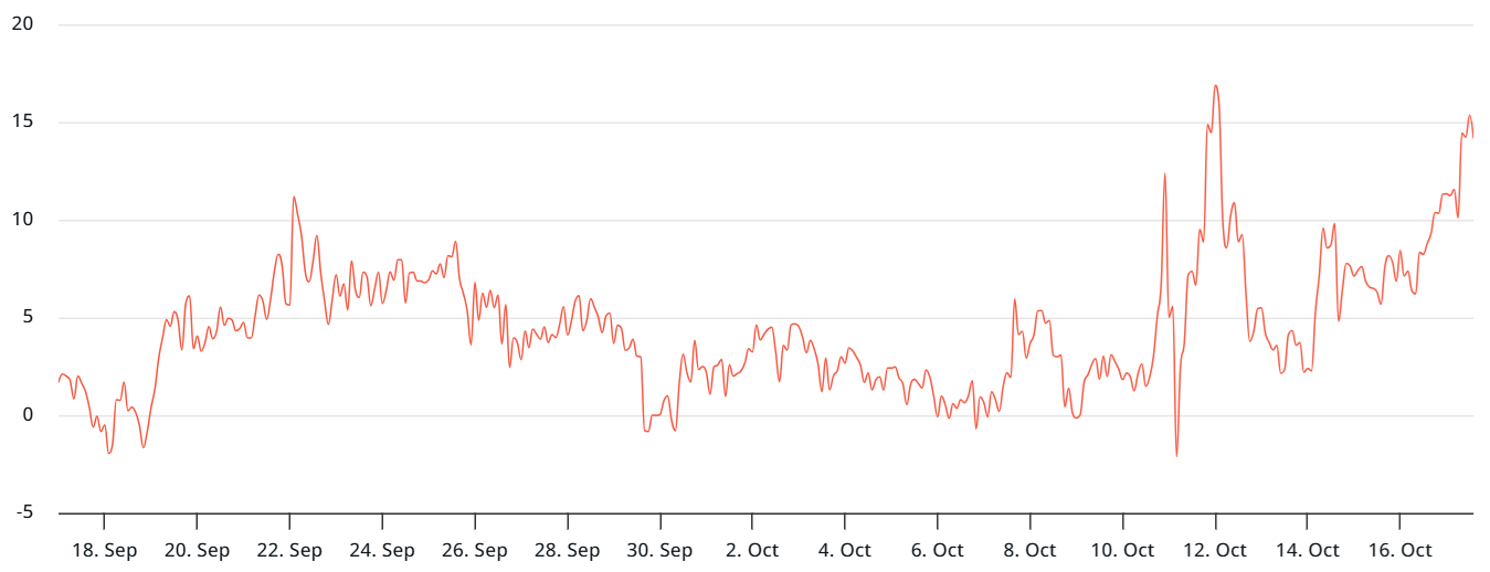 25-delta skew của quyền chọn Ether đã tăng vọt lên 14% vào thứ Năm, một mức độ hiếm khi duy trì và thường gắn liền với những giai đoạn lo sợ gia tăng. Các nhà giao dịch đang trả phí bảo hiểm cho quyền chọn bán (put), cho thấy các nhà tạo lập thị trường vẫn lo ngại về rủi ro giảm giá. Trong điều kiện thị trường bình thường, độ lệch này thường dao động trong khoảng từ -6% đến +6%.