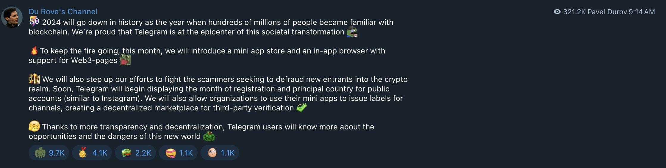 Ngoài ra, Durov còn công bố các biện pháp giảm thiểu lừa đảo trên nền tảng này bằng cách hiển thị tháng và quốc gia đăng ký cho các tài khoản người dùng công khai.