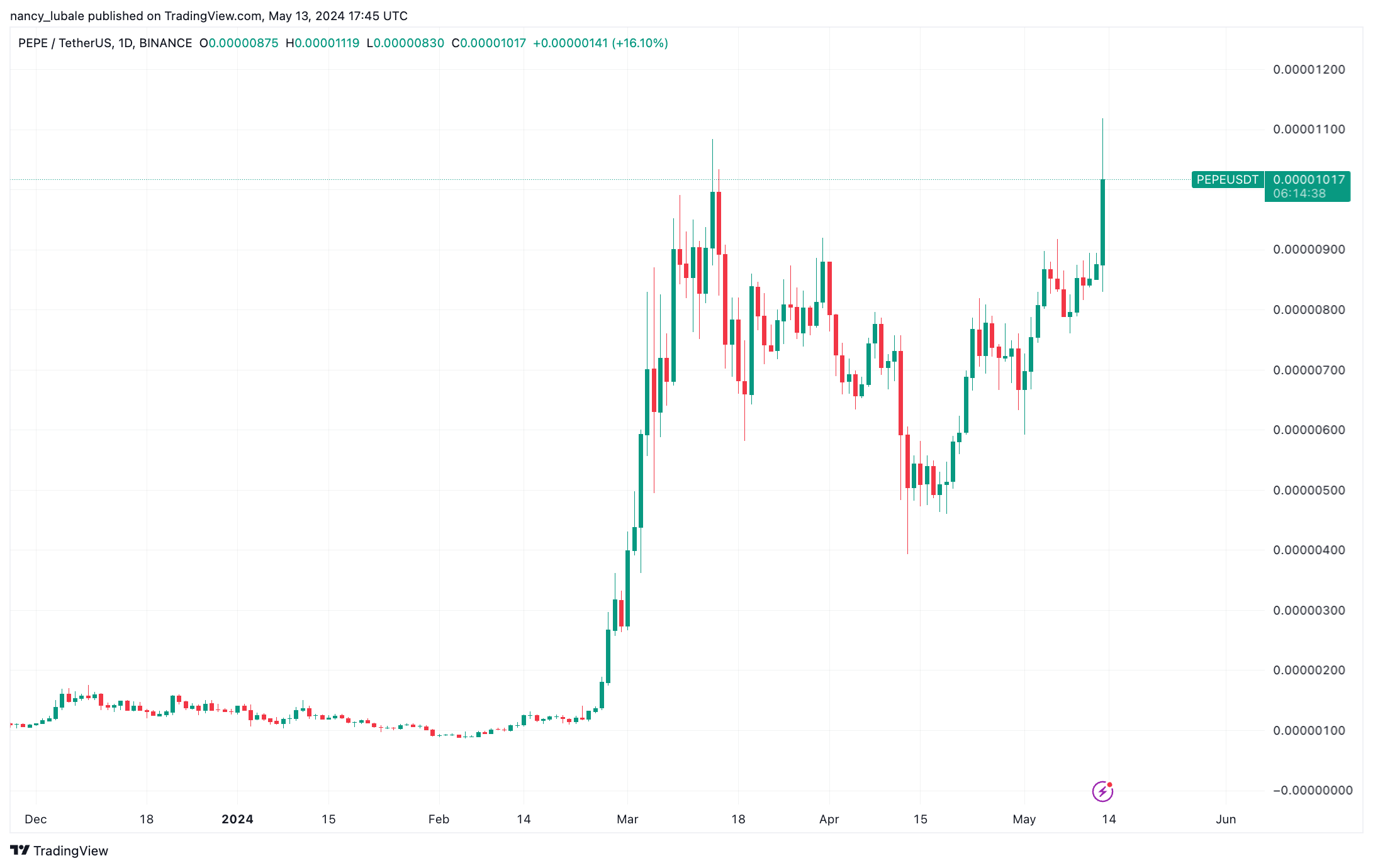 Giá Pepe (PEPE) lần đầu tiên đạt mức 0,000010 USD kể từ ngày 15 tháng 3. Dữ liệu từ TradingView cho thấy PEPE đã tăng 34% trong 24 giờ qua để thiết lập mức cao kỷ lục mới là 0,00001119 USD trên Binance.