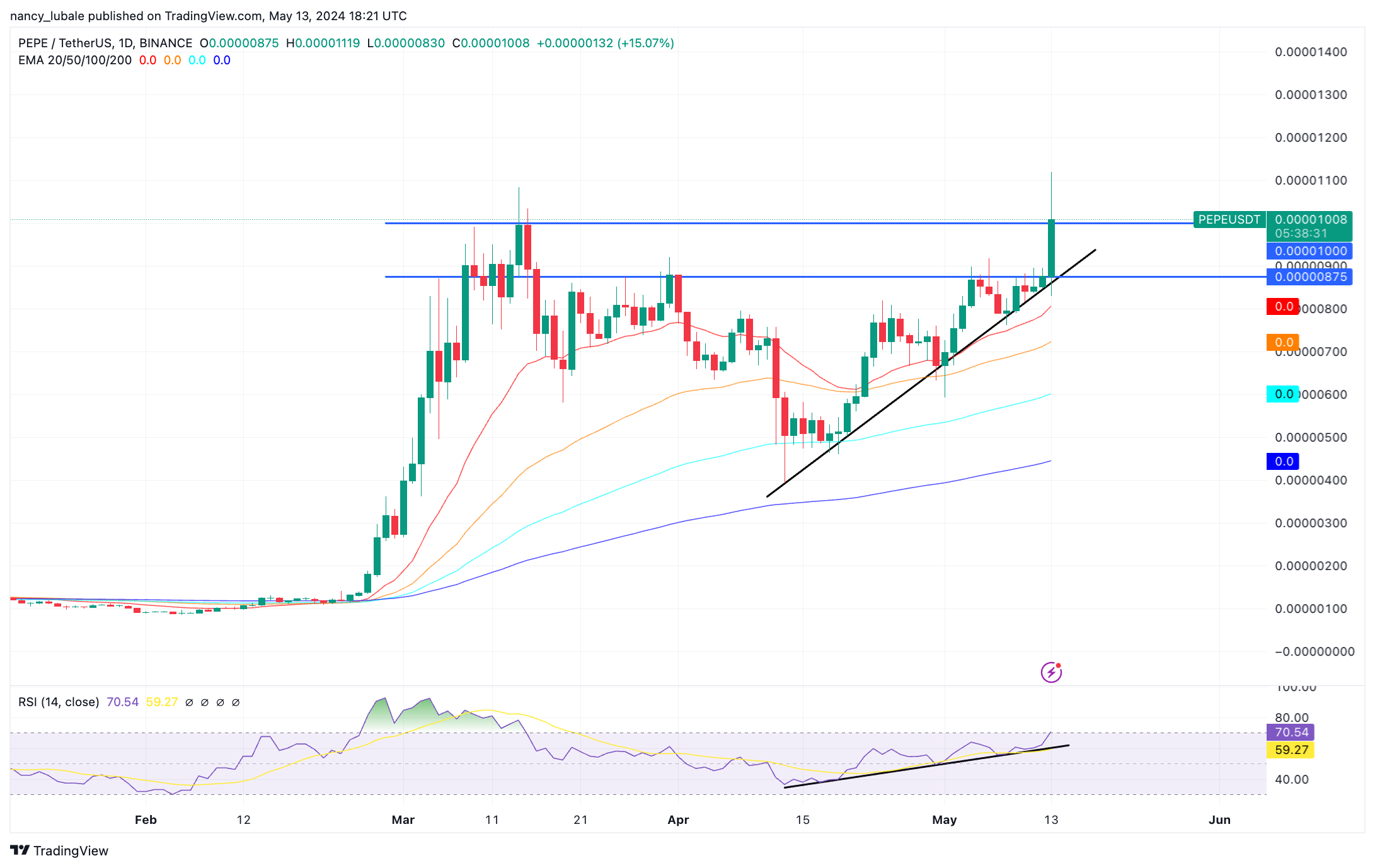 Sự phục hồi vào ngày 13 tháng 5 đã chứng kiến giá PEPE bật ra khỏi đường xu hướng tăng dần, vốn đã hỗ trợ nó kể từ giữa tháng Tư. Cuộc biểu tình mới nhất đã chứng kiến PEPE tăng trên mức kháng cự quan trọng, điều này đã củng cố giá kể từ tháng Ba.