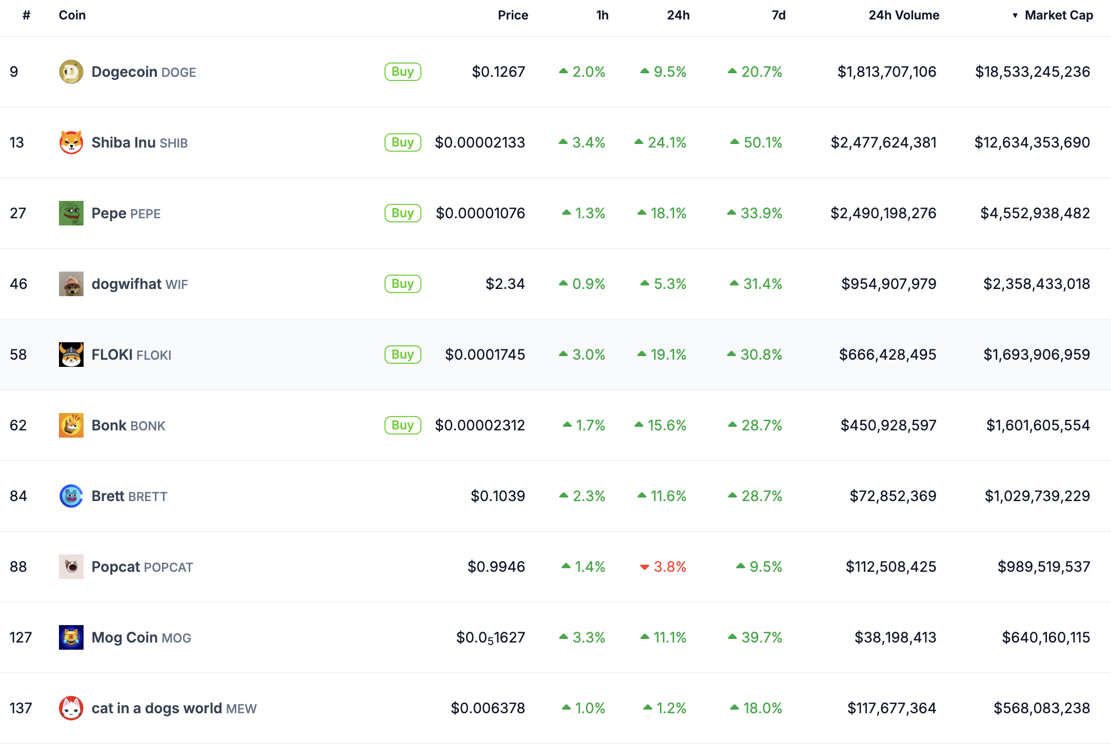 Memecoin nhấp nháy màu xanh lá cây trên toàn bảng