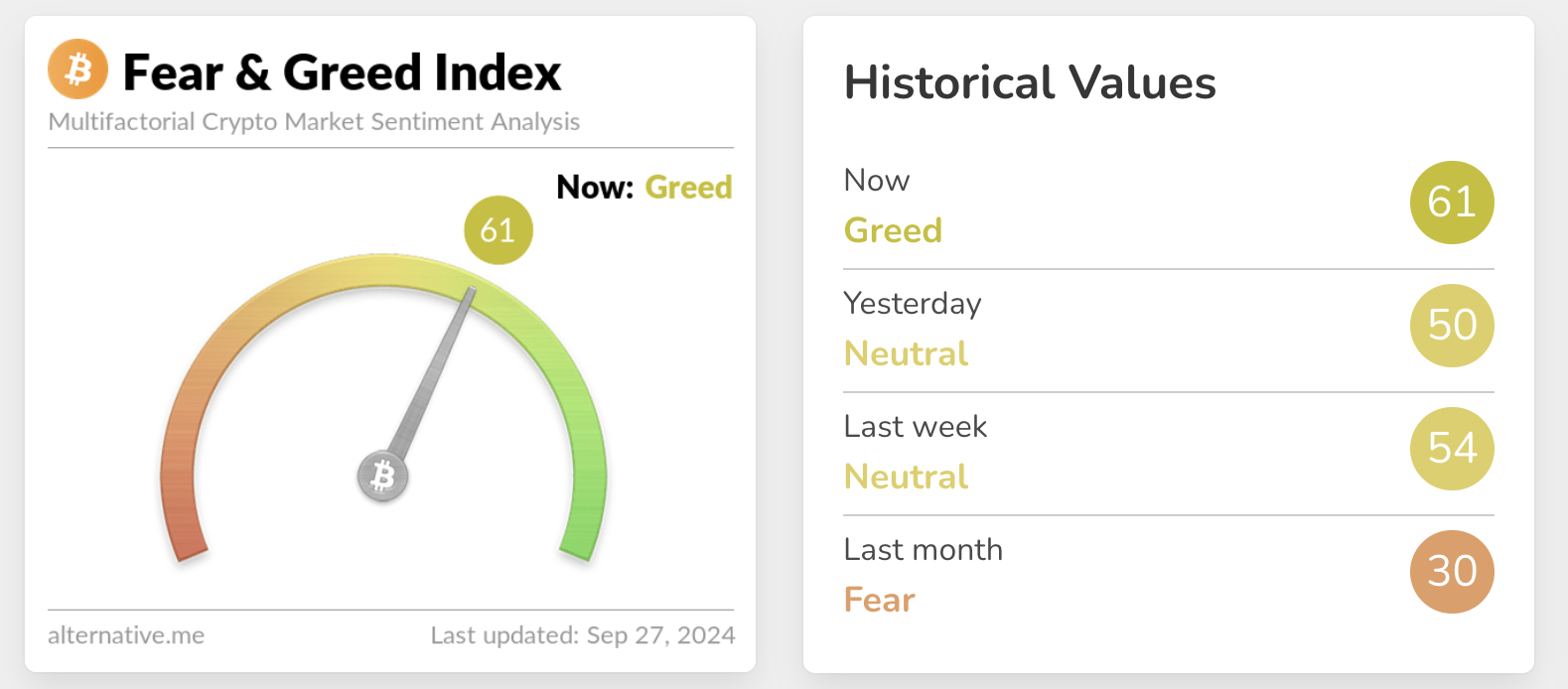 Dữ liệu từ Alternative, một nền tảng phân tích “cảm xúc và tình cảm” xung quanh tiền điện tử, cho thấy tâm lý thị trường đang lên khi Chỉ số Sợ hãi và Tham lam tiền điện tử đã bước vào vùng “tham lam” ở mức 61, tăng từ mức 30 của tháng trước khi thị trường chìm trong “nỗi sợ hãi”.