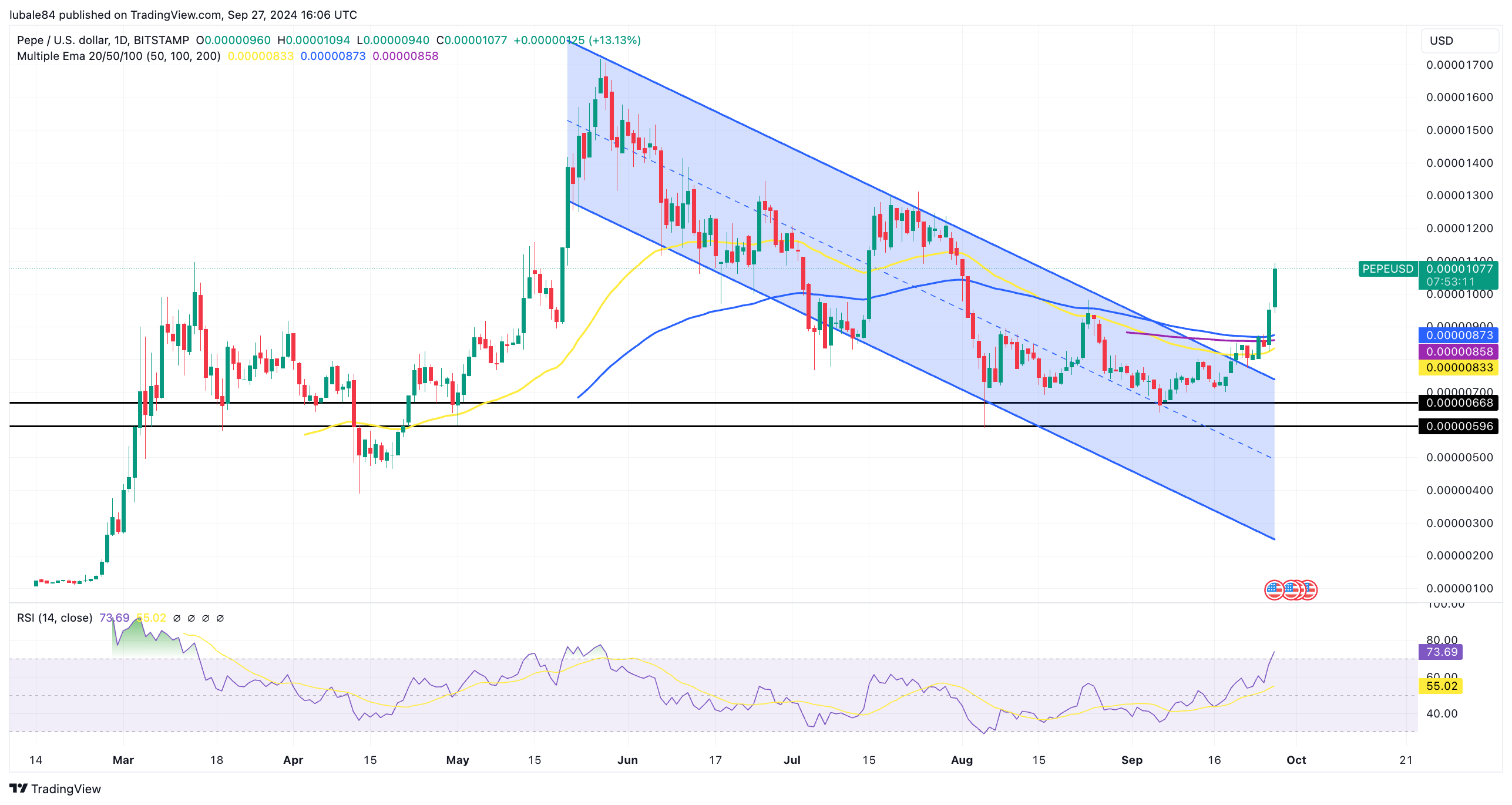 Vào ngày 20 tháng 9, giá PEPE đã vượt ra khỏi kênh song song giảm dần, tạo ra sức mạnh giúp giá vượt qua đường trung bình động hàm mũ (EMA) 50 ngày, 100 ngày và 200 ngày để trở thành ngưỡng hỗ trợ.